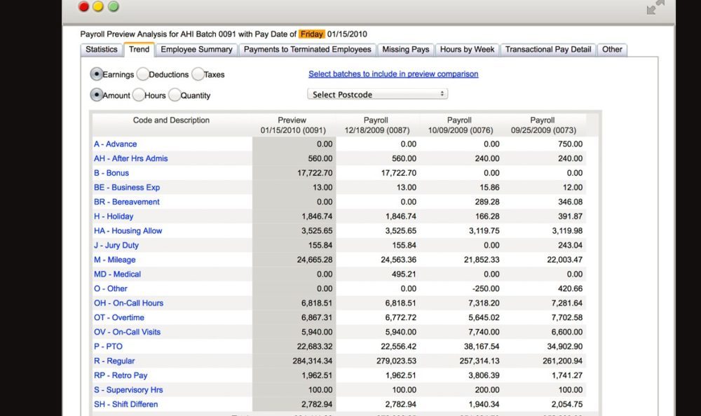 • Unique payroll preview mode allowing live analysis of the current payroll period compared to the past three historical periods