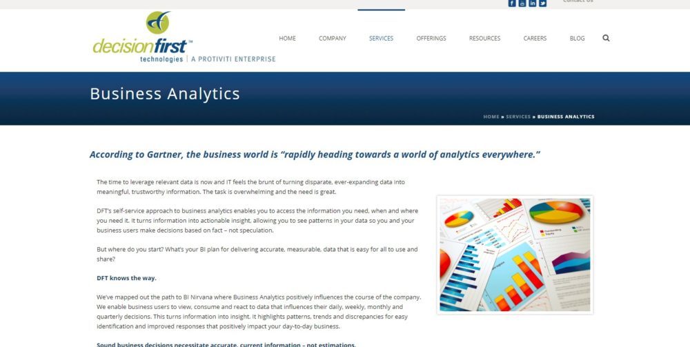 DFT’s self-service approach to business analytics enables you to access the information you need, when and where you need it. It turns information into actionable insight, allowing you to see patterns in your data so you and your business users make decisions based on fact – not speculation. DFT helps you create dashboards and visualizations to communicate information more clearly and effectively through graphical means. Whether through visual snapshots into profitability via sales, operations or manufacturing, or providing real-time insight into production line statistics; DFT helps you identify, define, plan and deliver the information that means the most to your organization . DFT leverages a powerful platform that helps your business manage and control data, create scalable, meaningful reports and provide secure, accurate information delivered across various devices. It’s about getting one version of the truth to the people who need it, when and where they need it, so they can act on it. Delivering business-driven data through custom tables, charts or graphs via web, mobile or print content is no small task. But meaningful and timely data produces real results. DFT helps you deliver accurate, secure, integrated data that you control – all with minimal dependence on IT.  DFT helps companies leverage predictive techniques to identify untapped opportunities and expose hidden risks. Insight, rather than hindsight, produces better business decisions.