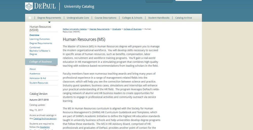 The DePaul University’s Master of Science (MS) in Human Resources degree program teaches students fundamental skills needed to manage the modern organizational workforce. The program helps students develop the skills to manage core HR functions, including workforce planning, staffing, performance management, total rewards, talent management, and training and development. Students in this program gain a real-world education in HR management delivered by a faculty leading scholars in the field that combine high-quality teaching with evidence-based recommendations. To complete the MS in Human Resources degree, you are required to take 12 courses across three groups which feature 5 core Human Resource courses, 4 Human Resource electives, and 3 Business electives. These courses are taught by faculty members who have won numerous teaching awards, and who bring many years of professional experience in a range of management-related fields into the classroom. The MS in HR Advisory Board, comprised of HR professionals and graduates of DePaul, provides another point of contact for the program and its students in the industry. The MS in Human Resources curriculum is aligned with the Society for Human Resource Management's (SHRM) HR curriculum guidebook and templates. The guidelines are part of SHRM's academic initiative to define and maintain high HR education standards for programs taught in university business schools. The program leverages DePaul's wide-ranging network of alumni and HR business leaders to create opportunities for students to engage in professional activities and community outreach via service learning. In addition, industry guest speakers, business cases, simulations and internships will enhance your practical understanding of the HR field.