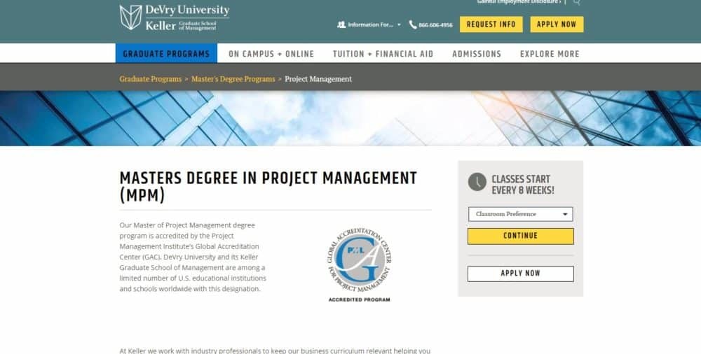 The Master’s in Project Management offered at DeVry University’s Keller Graduate School of Management is designed to help students develop the skills required to solve real-world management problems, and to exercise the right decisions through practical application of Project Management concepts. The program is instructed by industry professionals who keep the curriculum relevant helping you meet evolving market place demands. To earn the MPM degree, students are required to complete 39 semester-credit hours. The program’s coursework addresses such topics as cost management, quality control, planning and improvement. Assignments and projects focus on organizing, implementing and controlling business activities; achieving schedule, budget and performance objectives; and planning, budgeting and controlling multi-project programs that may involve legal and ethical issues, conflict resolution and application of project software. The program’s curriculum takes a holistic approach and also includes courses in such areas as accounting, finance, marketing, and applied statistics. It is designed to help students graduate with the skills required to successfully implement new programs or enhance existing ones. Keller Graduate School of Management offers the flexibility to complete your graduate program on your schedule. This allows students to balance work and life while preparing for the future. All students enrolled in the site-based program will be required to take some coursework online and, for some programs and locations, a substantial portion of the program may be required to be completed online.