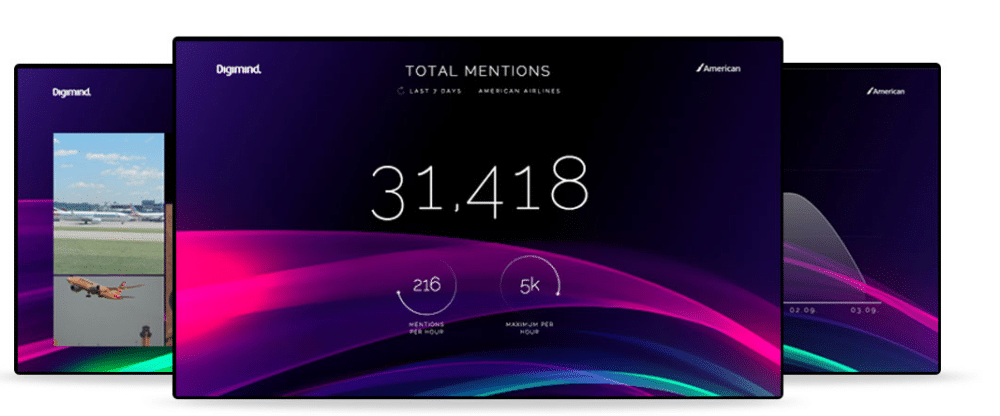 Digimind social media command centers changes the way companies present their social media data at live events or within the workplace via multi-screen displays of captivating visualizations. The number one goal of corporate social media teams is to engage their target audience. Digimind’s social media command centers leverage this opportunity at sporting events, trade shows, concerts, and other live events by putting a spotlight on social media communication. Viewers are presented with trending hashtags, relevant social media channels to connect with, live Tweets and mentions, and the most important alerts.