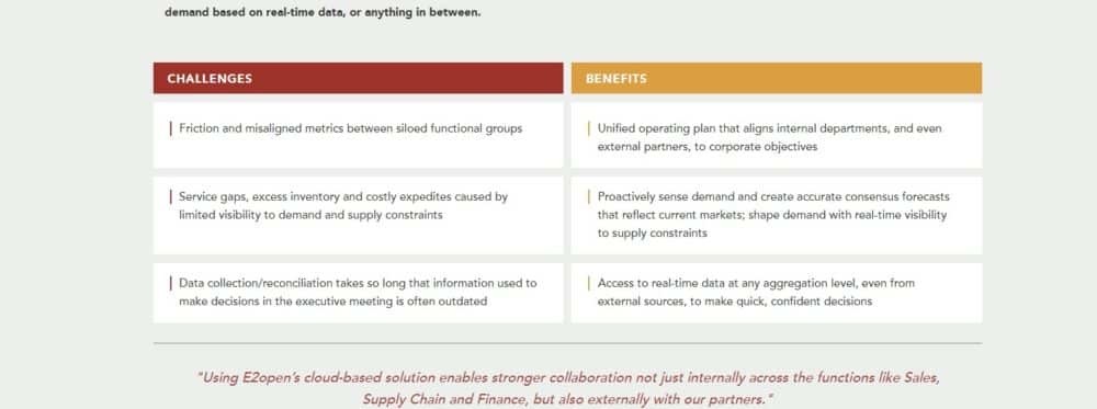 With E2open, one can integrate the existing data without losing any data. E2open’s supply chain monitoring enables advanced shipment notification management for customizable notifications and intransit –status updates. Supply chain analytics helps in analysis forecast accurately, management of data integration and analysis of data, inventory analysis, transportation analysis and warehouse analysis.