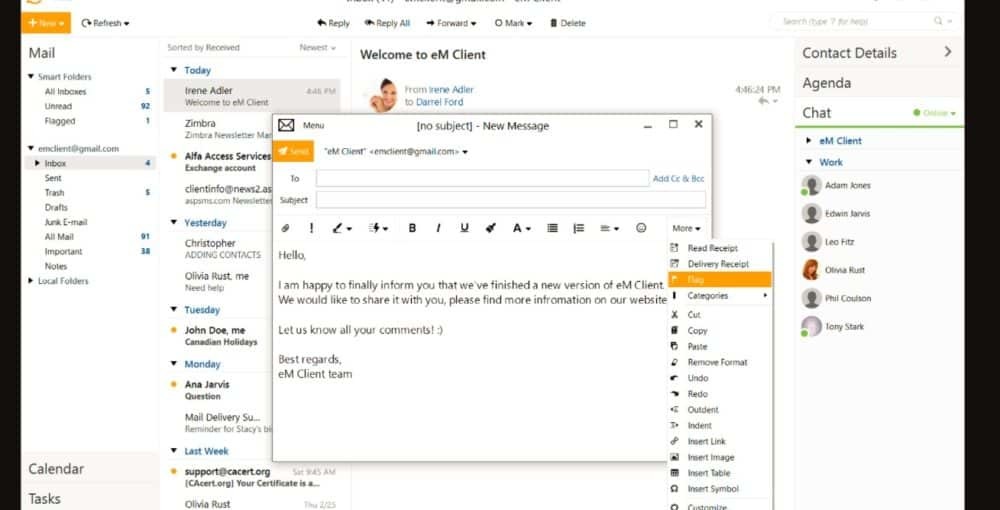 eM Client includes integrated chat, so there's no need for another application for chatting with friends as it also supports all common chat services, and it supports file transfer.