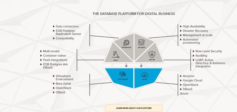 EnterpriseDB (EDB) provides software and services based on the open-source database PostgreSQL. EDB develops and integrates performance, security, and manageability enhancements into PostgreSQL to support enterprise-class workloads for its database, EDB Postgres Advanced Server. EDB has also developed database compatibility for Oracle to facilitate the migration of workloads from Oracle to EDB Postgres and to support the operation of many Oracle workloads on EDB Postgres. EnterpriseDB integrates with enterprise technologies and infrastructures for hybrid cloud management, data integration, and data warehousing. EnterprseDB customers benefit from the most reliable, high-performing, flexible, open, and cost-effective data management platform available. EDB’s Migration Toolkit (MTK) migrates tables, data, stored procedures (Oracle only) and custom developed packages (Oracle only) from SQL Server, Sybase, Oracle and MySQL to EDB Advanced Server. EDB Failover Manager (EFM) provides the high availability infrastructure for EDB Postgres. EFM monitors the members of a Postgres cluster, identifies and verifies database failures quickly and reliably, and, if needed, promotes a standby node to become the cluster master and issues alerts. EnterpriseDB has also developed enterprise-class tools for performance, scalability, high availability, and management. These tools enable database administrators to easily manage more and bigger Postgres database deployments. EDB helps organizations avoid vendor lock-in by providing an open source–based alternative to other database solutions and gives them more flexibility to find database solutions that match their business and operational needs. EDB also adds value with enterprise tool suites; a wide range of deployment options from on-premises to public, private, and hybrid clouds; and the services, support, and training needed by enterprises to be successful. The EDB performance optimizations for the RDBMS as well as compatibility APIs that ease transition from other leading database products have been identified by EDB customers as clear differentiators.