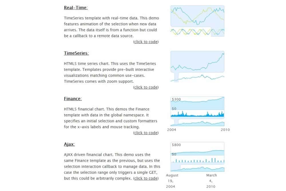 Create fast and interactive HTML5 visualizations with Envision.js, a library capable of displaying real-time data, time series, finance visualizations, AJAX-driven financial charts and custom visualizations, including fractals. Templates provide pre-built interactive visualizations matching common use-cases. TimeSeries comes with zoom support.