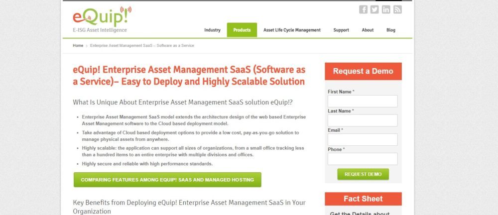 eQuip offers flexible administrative tools to customize data fields, forms, reports, and workflows, and it is easy to integrate with purchasing, ERP, IT discovery, Active directory systems. eQuip is affordable as it is one integrated application with an annual subscription or three-year contracts, and unlimited users. eQuip SaaS extends the architecture design of the web-based Enterprise Asset Management software to the cloud-based deployment model, and it is highly scalable, secure and reliable.