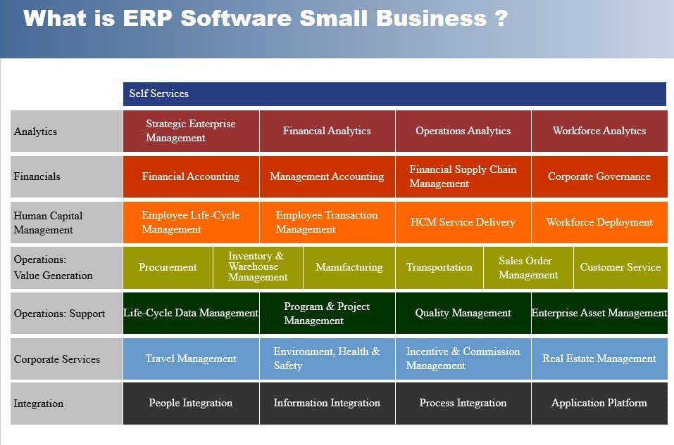 ERP Software for Small Business provides features such as Accounting, Business Intelligence, CRM, Human Resources, Inventory Management, Manufacturing, Supply Chain Management, Integration, and Analytics and Reporting. ERP system brings together all the activities of the organization, since the processes crosses more functional areas, in to an integrated into a single system.