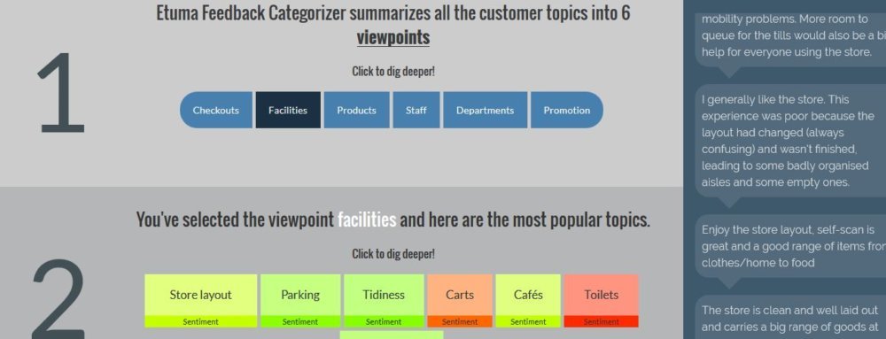 Etuma’s text feedback categorization service lets you know what your customers are talking about, ranking feedback categories and sentiment in order of importance. This allows you to choose when to take action in acute cases. It also detects the sentiment per category , letting you know which aspects of your product, service or campaign are positive or negative.