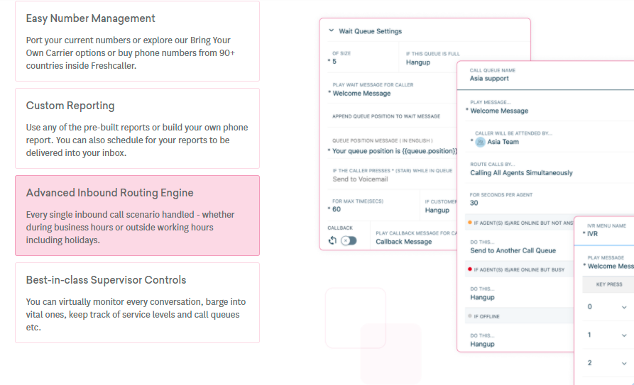 The mask your calls feature provides you an excellent platform to mask your existing phone numbers with an alternate number when making or receiving calls. Freshcaller provides an excellent platform to route calls to voicemail mainly by enabling a user to personalize their voicemail greetings, automate dropping voicemails, and route after-hours calls to voicemail. Freshcaller also provides an excellent platform to segment calls with Multi-Level IVR and set up a fully flexible PBX system with capabilities of routing calls to agents along with ability to feature self-service options.