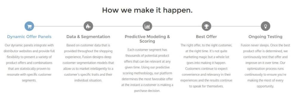 Fusion dynamic panels integrate with distributor websites and provide full flexibility to present a variety of product offers and combinations that are statistically proven to resonate with specific customer segments.