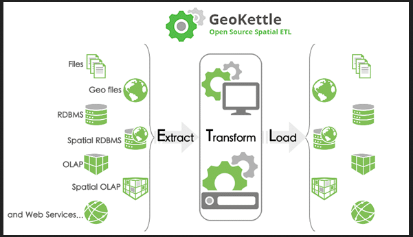 GeoKettle enables the Extraction of data from data sources, the Transformation of data in order to correct errors, make some data cleansing, change the data structure, make them compliant to defined standards, and the Loading of transformed data into a target DataBase Management System (DBMS) in OLTP or OLAP/SOLAP mode, GIS file or Geospatial Web Service.