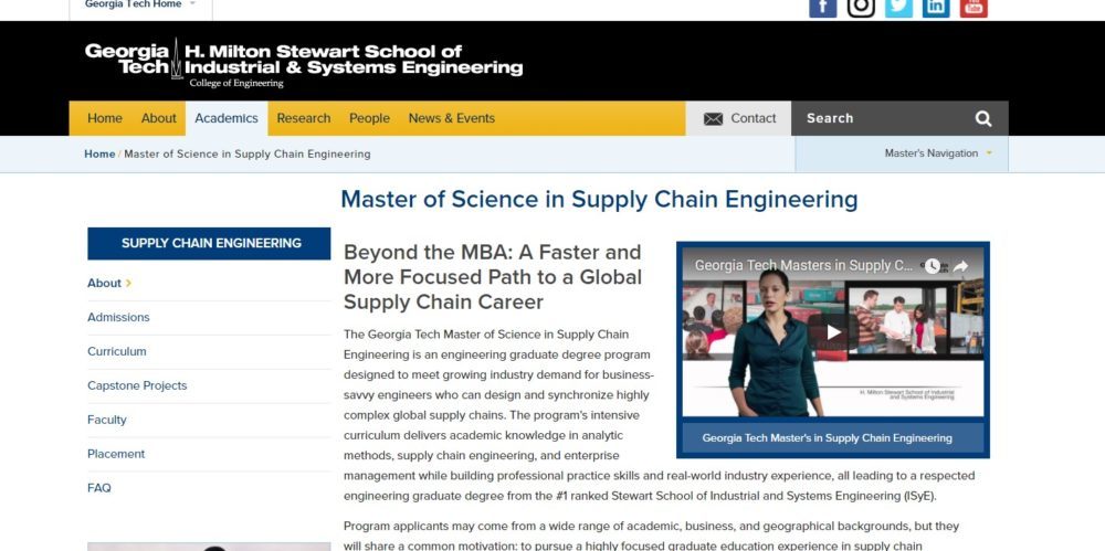 The Georgia Tech Master of Science in Supply Chain Engineering graduate degree program is modeled to provide students with a highly focused graduate professional education in supply chain engineering that leads to a faster and more focused path to a global supply chain career.