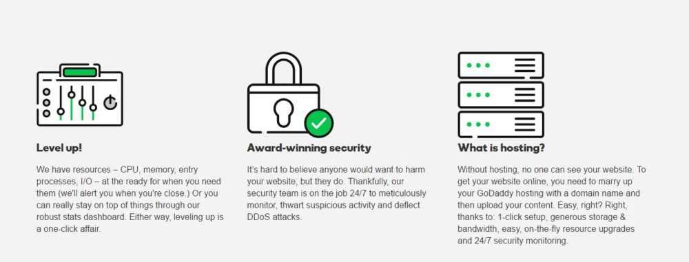 GoDaddy provides hosting that grows with its users’ businesses. They offer both Windows and Linux plans than come with one-click install of WordPress, Drupal, Joomla and more. They have resources: CPU, memory, entry processes and I/O at the ready for when their users need them.