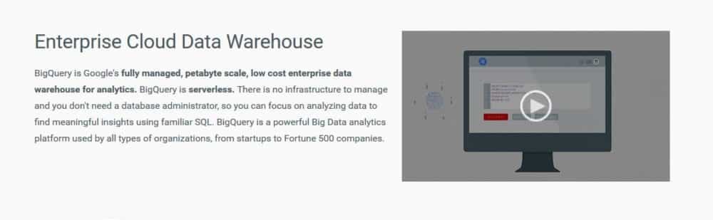 Google BigQuery is Google's fully managed, petabyte scale, low cost enterprise data warehouse for analytics and is serverless. There is no infrastructure to manage and users don't need a database administrator, this means that an enterprise can focus on analyzing data to find meaningful insights using familiar SQL. Google BigQuery is a powerful Big Data analytics platform used by all types of organizations even those who are just startups.Google BigQuery is powered with both speed and scale. BigQuery can scan TB in seconds and PB in minutes. Load company data from Google Cloud Storage or Google Cloud Datastore, or stream it into BigQuery to enable real-time analysis of the data. With BigQuery, companies can easily scale their database from GBs to PBs.Google BigQuery separates the concepts of storage and compute, allowing users to scale and pay for each independently. It also provides flexible pricing options to better suit every need. An enterprise can either choose a pay-as-you-go model or a flat-rate monthly price for those who need cost predictability.Google BigQuery automatically encrypts and replicates company data to ensure security, availability and durability. This means that users can further protect their data with strong role-based ACLs that they configure and control using Google’s Cloud Identity & Access Management system. With Google BigQuery’s powerful integration, the Google Cloud Platform partners and 3rd party developers have developed multiple integrations with BigQuery so that users can easily load, process, and make interactive visualizations of their data. Google BigQuery’s partners include Looker, Tableau, Qlik, Talend, Google Analytics, SnapLogic and more.