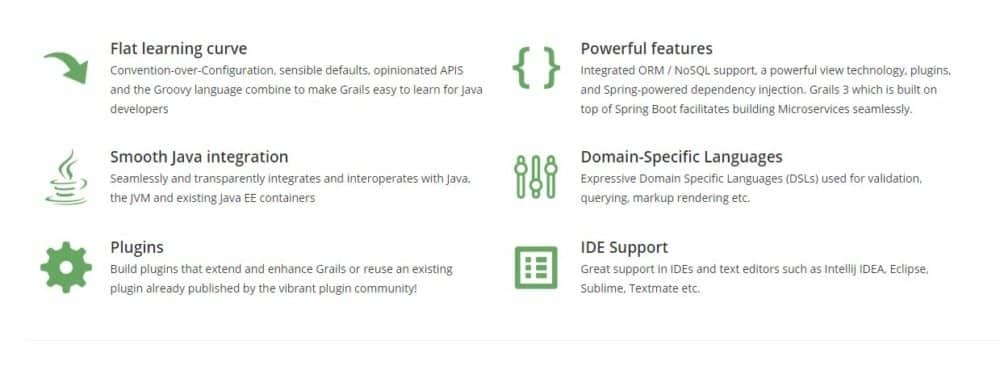 Grails Seamlessly and transparently integrates and interoperates with Java, the JVM and existing Java EE containers.The Grails uses Expressive Domain Specific Languages (DSLs) used for validation, querying, markup rendering etc. The Build plugins that extend and enhance Grails or reuse an existing plugin already published by the vibrant plugin community.Grails has Great support in IDEs and text editors such as Intellij IDEA, Eclipse, Sublime, Textmate etc.