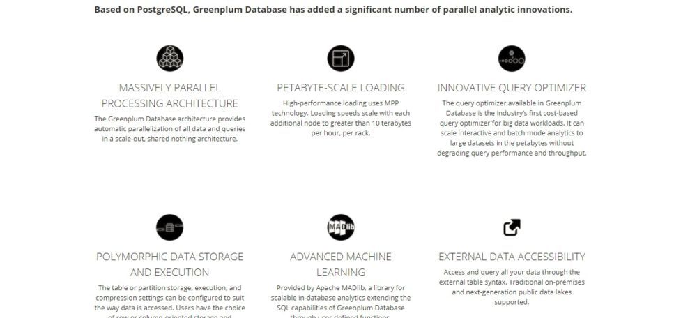 Greenplum Database is an advanced, fully featured, open source data platform. It provides powerful and rapid analytics on petabyte scale data volumes.