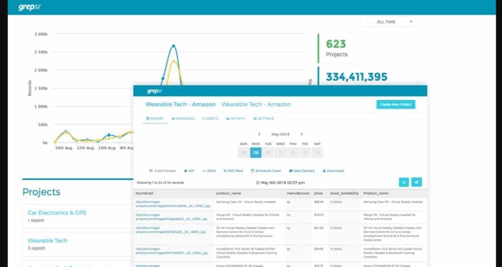 GREPSR provides you access to a user-friendly, browser-based web scraping tool. With GREPSR, you can gloss the data you want to extract from the web through one-click file sharing tool; export extracted data in any format such as CSV files, PDF document, XML feeds, or use the available rest-APIs to transfer data into your system; schedule your extraction and get the latest updates automatically through the crawl calendar; get notification on extracted information, and keep tabs on your project activities.