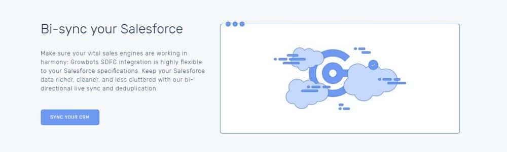 ADDITIONAL INFORMATION The only platform you need to fully automate outbound sales. Growbots will identify your perfect customers. Growbots makes sure you never contact any of your existing customers with your outbound campaigns. Customized field-mapping allows you to choose exactly what information you’d like to update in Salesforce, based on Growbots campaign and prospect data.
