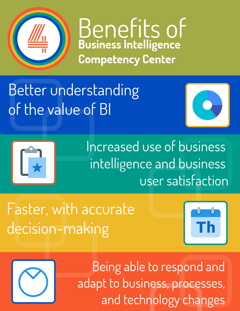 - Faster, with accurate decision-making: Fast delivery of quality information is one of the biggest benefits of BICC to an organization. BICC ensures that the BI structures are able to analyze the data provided and provide reliable decision-making that will enable the business to grow and meet its goals.