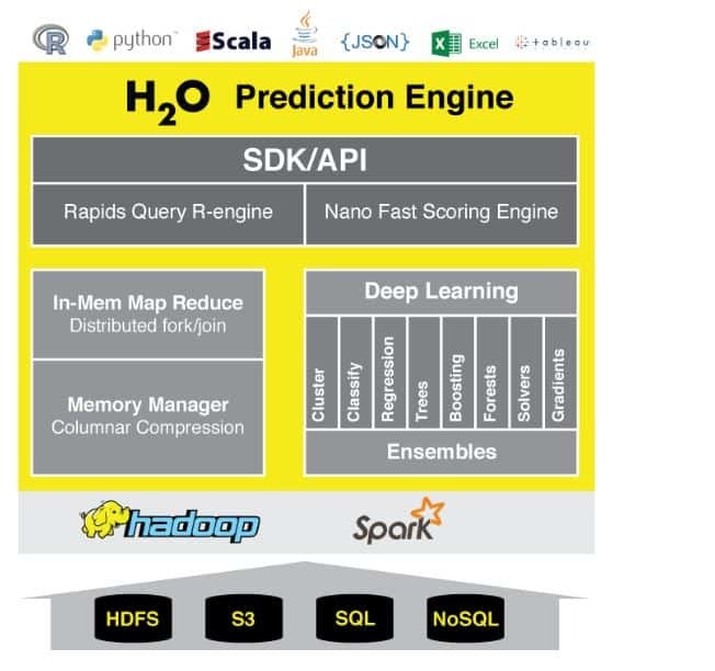 H2O is an Open Source Fast Scalable Machine Learning API for Smarter Applications (Deep Learning, Gradient Boosting, Random Forest, Generalized Linear Modeling (Logistic Regression, Elastic Net), K-Means etc.H2O makes it possible for anyone to easily apply machine learning and predictive analytics to solve today’s most challenging business problems.
