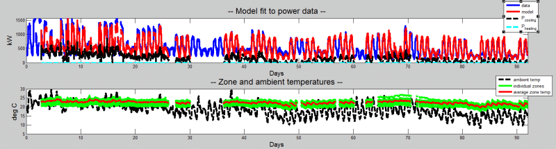The team builds a PEO model in MATLAB that captures the effect of the HVAC system and ambient conditions on internal temperatures in each zone, as well as on the total power consumption for the building. Using Control System Toolbox they analyze HVAC control system poles and zeros to estimate overall power consumption and determine how quickly each zone is likely to converge to its set point.