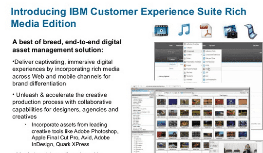 IBM Customer Experience Suite delivers rich, engaging and personalized web experiences through multiple channels. This customer experience management software integrates social and mobile technologies with content and analytics to help you anticipate customer needs and build brand loyalty. Use customer experience management software tools to help you develop and manage dynamic content and rich media, and deliver them to a variety of channels. Create more targeted campaigns and dynamically adapt content and offers based on user actions and preferences.Make it easier for users to interact with your business and share ideas and opinions. Communicate throughout multiple channels such as mobile devices, other websites, social sites, kiosks and email. Link to back-office applications, cloud-based services, social sites and more.