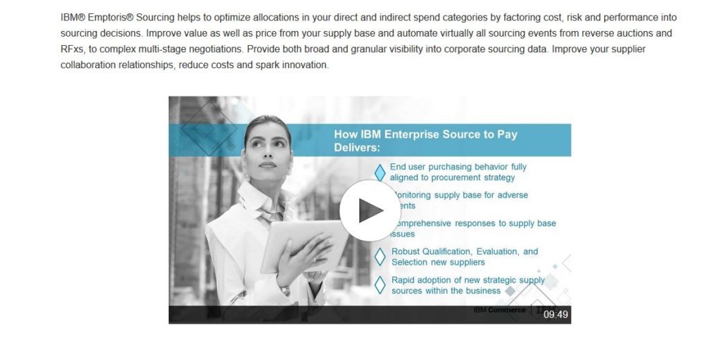 Emptoris Sourcing is an IBM software that simplifies complex sourcing decisions and events, helping to optimize value and reduce costs. It helps to optimize allocations in the direct and indirect spend categories by factoring cost, risk and performance into sourcing decisions.