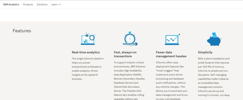 IBM Informix is a secure embeddable database, optimized for OLTP and Internet of Things (IoT) data. Informix has the unique ability to seamlessly integrate SQL, NoSQL/JSON, time series and spatial data. With four available editions, everyone from developers to global enterprises can benefit from its reliability, flexibility, ease of use and low total cost of ownership. The single Informix platform helps you power transactional workloads to enable analytics-driven insights at the speed of business. To support mission-critical environments, IBM Informix includes High Availability Data Replication (HADR), Remote Secondary Standby Database Servers and Shared Disk Secondary Server. The Flexible Grid feature also enables rolling upgrades without any outages. Informix offers easy deployment features like “smart triggers” that implement event-driven processing and database push notifications, without any schema changes. This allows users to automate data management and focus on core business. With a silent installation and small footprint that requires just 100 Mb of memory, Informix is simple and non-disruptive. Self-managing capabilities make it ideal as an embedded data management solution. Informix can be up and running in minutes, not days. Server version upgrades can be applied to a cluster of servers while permitting users to connect to the database and continuously access their data with no downtime. Servers and client connections can be configured to guarantee that no transactions are lost, even if the primary server or its host goes offline. This combination of features ensures that Informix is always on and always available. Its ability to integrate time series data with relational data make it ideal for monitoring and for the analytical processing of time oriented data such as utility supply, weather tracking, logistics and warehouse management.