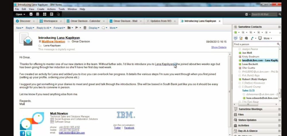 Access and initiate presence awareness and instant messaging chats from the IBM Note email client using IBM Sametime. Also, IBM Sametime offers online meetings, voice, video and file sharing. IBM enables application developers to embed content from applications inside of OpenSocial 2.0 containers, such as a gadget or web page.