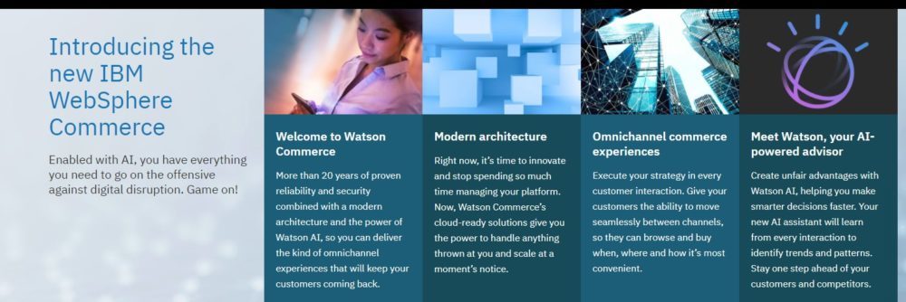 IBM Watson Commerce is ecommerce software that is enabled with AI to ensure you have everything you require to face digital disruption. IBM Watson Commerce uses a modern architecture that enables you to innovate and spend less time on managing your business platform.