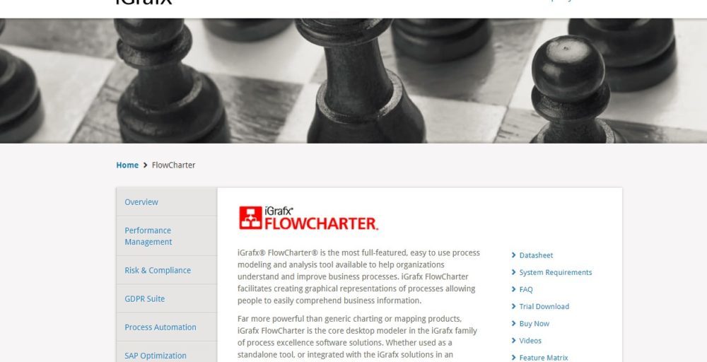 iGrafx FlowCharter provides an excellent platform for creating of graphical representations of processes that enable people to easily understand any business information. iGrafx FlowCharter can be used as standalone tool or integrated with other solutions to enhance a powerful way of drawing flowcharts than mapping products or generic charting. iGrafx FlowCharter enables you to reduce the time taken to document business systems and processes.