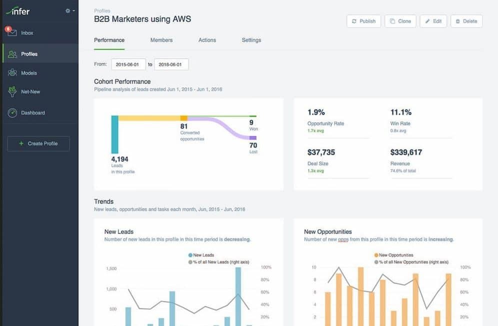 Machine learning algorithms identify potential target market. Potential customers who are likely to become customers. The software integrates advanced customer intelligence with predictive intelligence, in order to make best analysis and to produce most accurate results. Infer has been empowering users to win more and more customers.