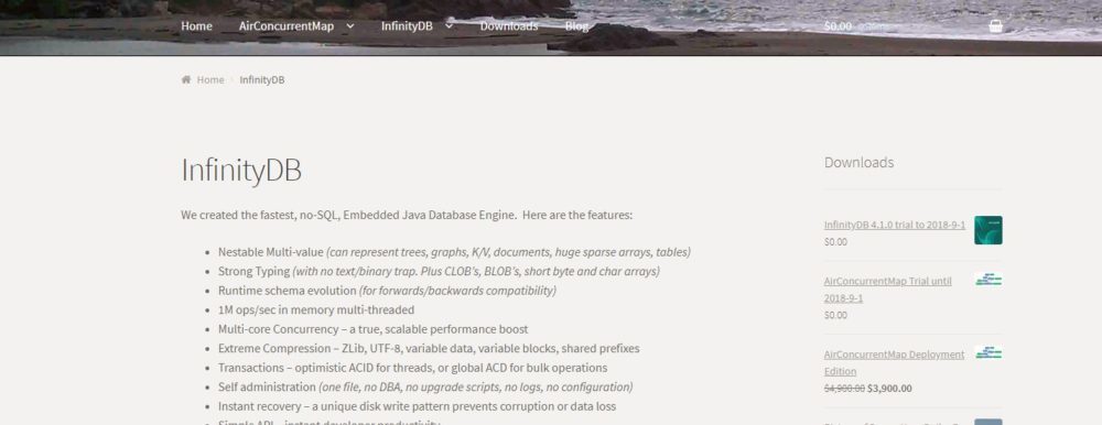 InfinityDB uses a rugged internal storage update protocol for persistence on demand or cache spilling to disk for large amounts of data that maintains system-wide data integrity, and survives abrupt application termination, file system bugs, and kernel panics. The single data file remains up-to-date, safe, correct, and usable through any event. There is no log-based recovery, hence restart and recovery is immediate in all cases. InfinityDB is designed to use one single file. The combination of this feature and the instant recovery help make this product administrator free. No logs need to be archived or re-applied. There are no configuration files, temporary files, or text logs. No junk files are left behind after any kind of termination, so there is never any cleanup. InfinityDB provides a rich data representation space for structured, semi-structured, or unstructured data. The simple basic data model is used by the application to define and represent any mixture of trees, graphs, key/value maps, documents, text indexes, huge sparse arrays, tables with an unlimited number of columns of an unlimited number of values per row and column, nested multi-maps, inverted Entity-Attribute-Value triples, or creative custom structures. Use InfinityDB as an In-Memory-Only DBMS keeping all data in the cache, or let it grow smoothly to hundreds of GB with no code changes. Access to data in the memory cache is fully multi-core, while infrequently used data is paged to disk transparently. Data is operated on efficiently with fine granularity for small or large data structures regardless of memory capacity. Fine granularity accesses transition smoothly to coarse block-oriented granularity when and where needed.