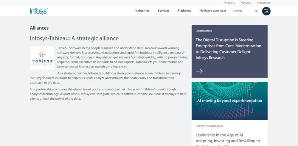 As a strategic partner, Infosys is building a strong competence across Tableau to develop industry-focused solutions to help our clients analyze and visualize their data easily and transform their approach to big data. This partnership combines the global talent pool and client reach of Infosys with Tableau’s breakthrough analytics technology. As part of this, Infosys will integrate Tableau’s software into the solutions it deploys to help clients unlock the power of big data.