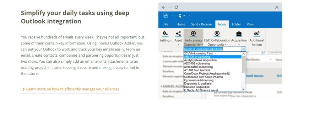 Inova is designed for partnering in the life sciences, meaning it comes preconfigured to store and manage information about the user’s partnerships so users will immediately find all the related contacts, assets, discussions, meetings, and documents, including agreements, emails and meeting minutes. Inova also features an Outlook Add-in which lets the users easily create new contacts, track key emails and update partnering projects straight from Outlook.