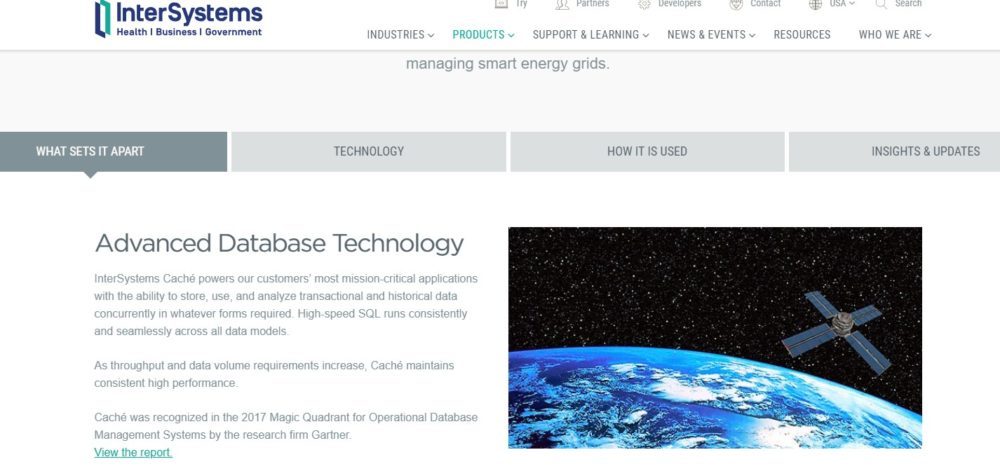 InterSystems Caché is an advanced database management system and rapid application development environment. InterSystems Caché takes the complexity out of application design and deployment. Several high-availability options, including an elegant approach to mirroring, endow applications with robust reliability – but require less hardware than other vendors’ solutions. A flexible, adaptable security model with easy-to-use provisioning capabilities makes it simple to control access to resources. With the overall simplicity of its architecture, and powerful system management tools, Caché requires fewer database administrators (DBAs) than other databases. Within Caché, data can be modeled and stored as tables, objects, or multidimensional arrays (hierarchies). Different models can seamlessly access data – without the need for performance-killing mapping between models. Built-in support for dynamic data objects (such as XML and JSON) enables easy interoperability and rapid development of Web applications. SQL is the lingua franca for querying Caché data across all data models. Because of its efficient architecture, Caché provides inherently faster SQL performance than other database technologies. It supports traditional indexes as well as bit-map and bit-slice indexes that can be used with real-time transactional data. InterSystems Enterprise Cache Protocol allows a network of many servers to behave as a single data store, dramatically enhancing the scalability and performance of distributed applications. Applications based on Caché maintain a very high level of performance, even as they scale up in transaction volume, number of users, and concurrent analytical queries. At its core, Caché is a key value hierarchical database that has compact storage, excellent memory caching, fast reads and writes, optimized index traversing, all underpinned with ACID transactions.