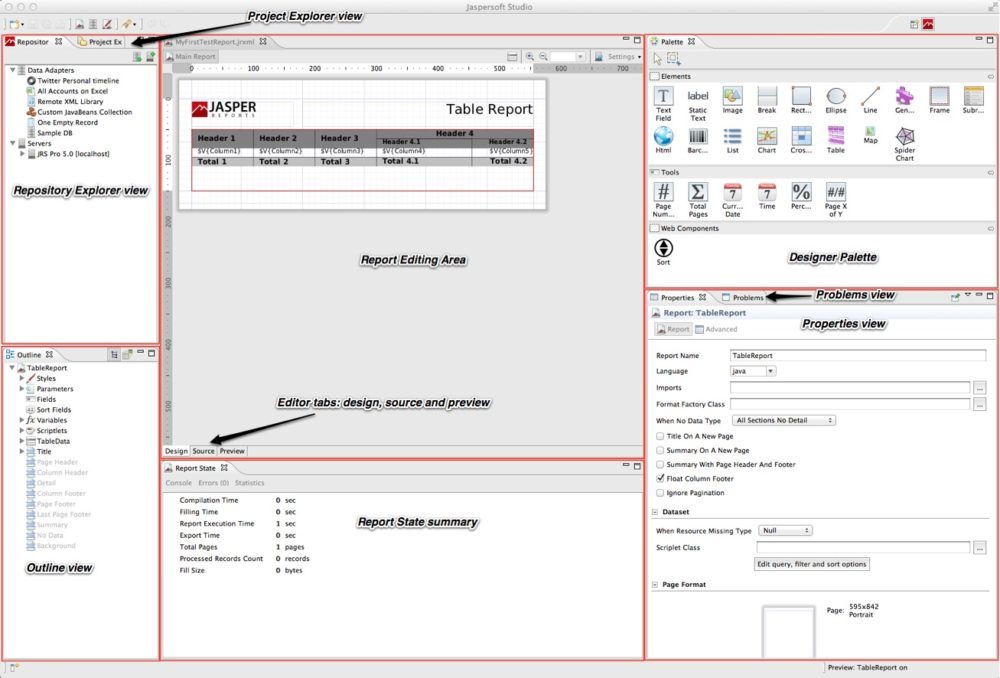 Jaspersoft Studio is the eclipse-based report designer for JasperReports and JasperReports Server. Jaspersoft Studio create very sophisticated layouts containing charts, images, subreports, crosstabs and much more. Jaspersoft Studio lets access the data through JDBC, TableModels, JavaBeans, XML, Hibernate, CSV, and custom sources and publish reports as PDF, RTF, XML, XLS, CSV, HTML, XHTML, text, DOCX, or OpenOffice. Jaspersoft Studio configure data sources and use them in reports and data driven wizards help design reports much quicker. Jaspersoft Studio is offered in two different versions a standalone RCP product, and an Eclipse plug-in version. Both standalone and plug-in version have a similar UI.