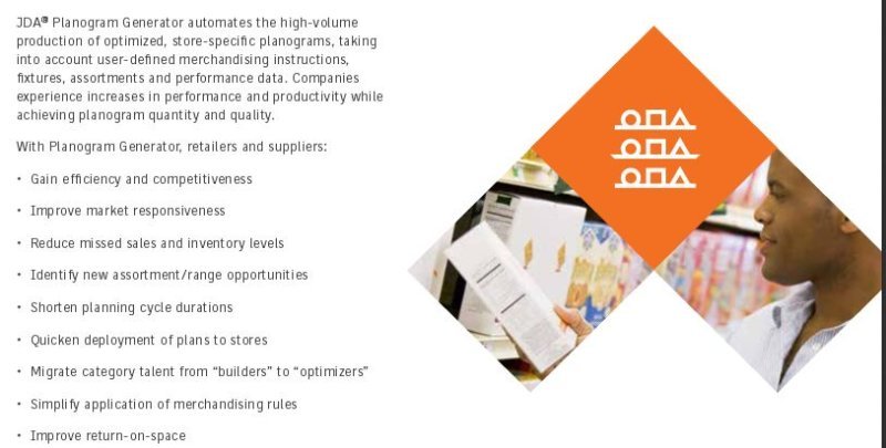 JDA Planogram Generator Client (myPG) Automated Planogram Generation to Individual Users : In today’s increasingly crowded, omni-channel marketplace, retailers and manufacturers can win by creating highly customized space plans that cater to local customer needs. Having the right product mix available — even in a very limited space — reduces stockouts, cuts inventory costs, improves shopper satisfaction and maximizes margins. However, scaling to the high volume of planograms necessary to achieve localization can typically lead to additional headcount and compromised quality.