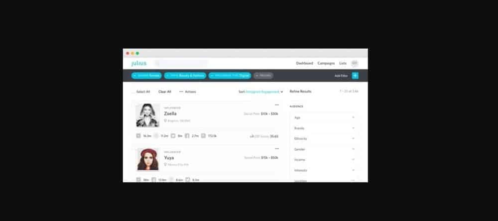 Julius is a data driven influencer marketing platform. It gives access to data of more than 75,000 influencers who are researched by a team of real people. Julius gives insights for influencers’ content style, interests, past brand work, audiences’ demographics among others. It has more than 30 searchable data points that help you do a specific search or do a broad search depending on your search preference.