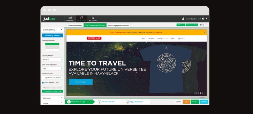 The user gets the power and flexibility they deserve with a world-class design drag and drop canvas, robust targeting engine, and 50+ email and CRM integrations. The user runs effective sales promotions and engages high-intent visitors at key moments during the purchasing process to drive more sales conversions. The user identifies and converts cart abandoners with enticing promotions. Justuno helps to clearly notify the visitors of relevant information such as sales, events, shipping information, and more.