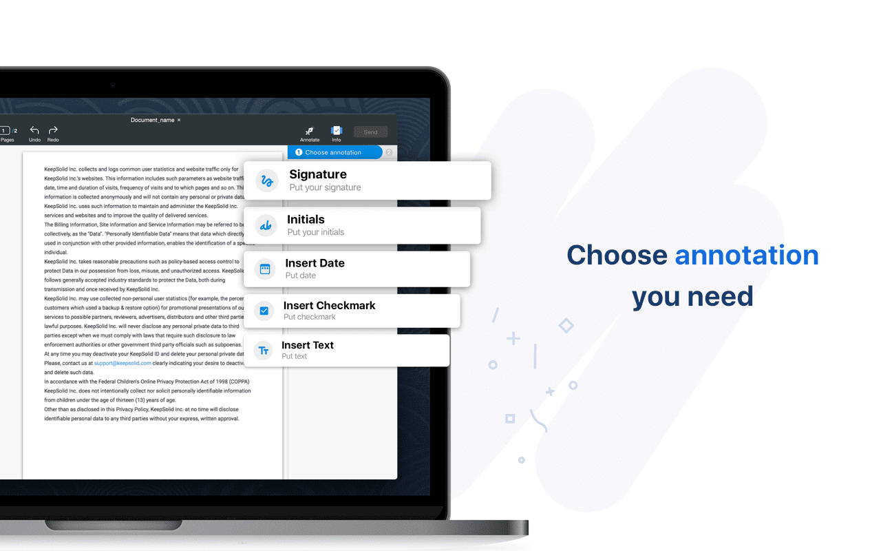 The app also allows fixing a signing order, simplifying the required access rights, and leaving a comment to help in setting the record straight. KeepSolid Sign allows adding the necessary annotations. The multi-platform e-signature achieves this by creating a digital signature and signing any agreement or contract quickly. It also allows adding annotations like notes, dates, and checkmarks.