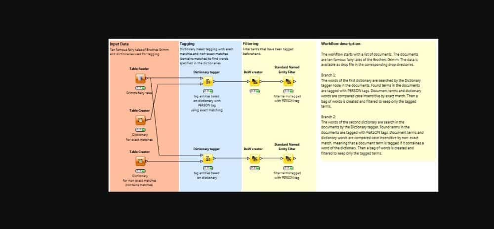 This feature allows for the parsing of texts available in various formats (e.g. Xml, Microsoft Word or PDF and the internal representation of documents and terms) as KNIME data cells stored in a data table. It is possible to recognize and tag different kinds of named entities such as names of persons and organizations, genes and proteins or chemical compounds, thus enriching the documents semantically. Furthermore, documents can be filtered (e.g. by stop word or named entity filters), stemmed by stemmers for various languages and preprocessed in many other ways. Frequencies of words can be computed, keywords can be extracted, and documents can be visualized (e.g.tag clouds).