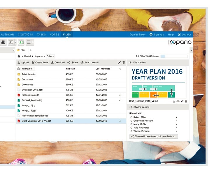 Kopano works on mobile as well. Push synchronization means you are always up to date whether you are in the office or on the road. Kopano helps you work smarter with people within and outside your organization. A single interface gives you email, contacts, advanced calendaring, file sharing, web meetings and more. Web meetings take advantage of high-quality audio, video, chat and presentation tools.