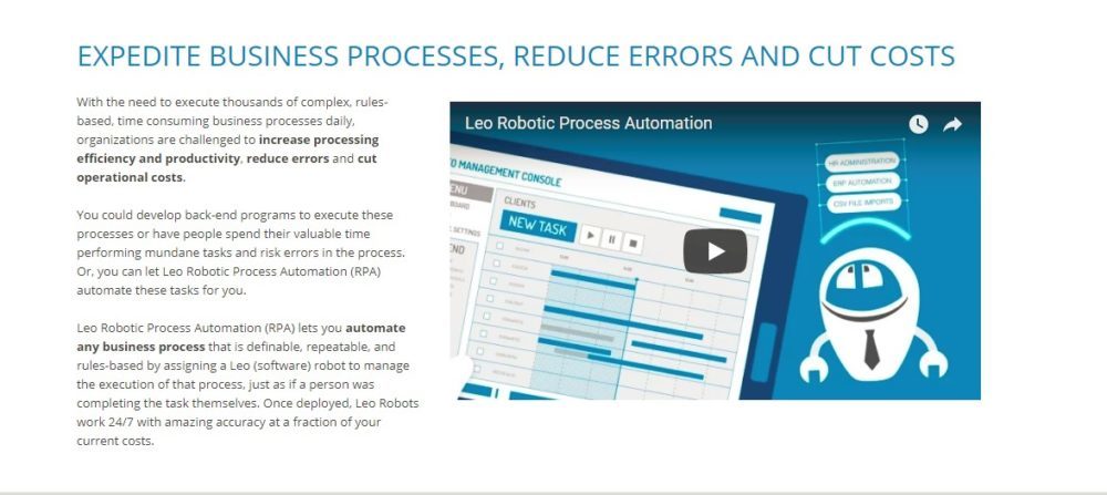 Kryon also has a flagship platform called Leo which allows companies to automate business processes quickly and easily, for immediate productivity gains, near zero error rates, reduced costs and significant ROI results. Leo Robotic Process Automation (RPA) lets the users automate any business process that is definable, repeatable, and rules-based by assigning a Leo (software) robot to manage the execution of that process, just as if a person was completing the task themselves. The users can also ensure that the tasks done by employees will also be executed quickly, error free and in compliance with corporate policy and attended automation.