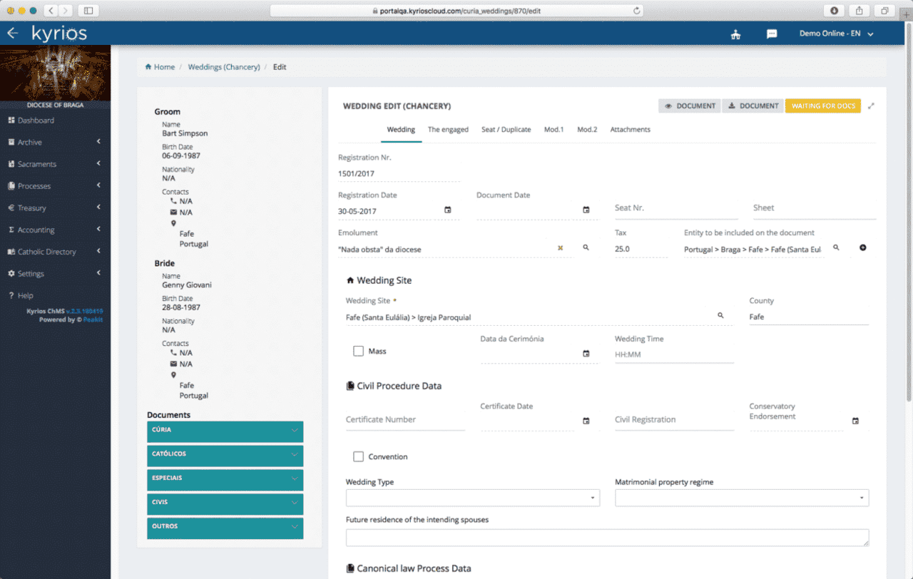 •Possibility to have all the parishes os a Diocese integrated with the Chancery