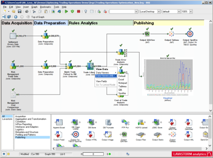 Lavastorm solves each of these problems by giving business analysts drag and drop capabilities specifically designed to help them master predictive analytics. This capability within the Lavastorm Analytics Engine’s visual, data flow driven approach enables a new method for authoring advanced analyses by providing a single shared canvas upon which users with complementary skill sets can collaborate to rapidly produce robust, trusted analytical applications.