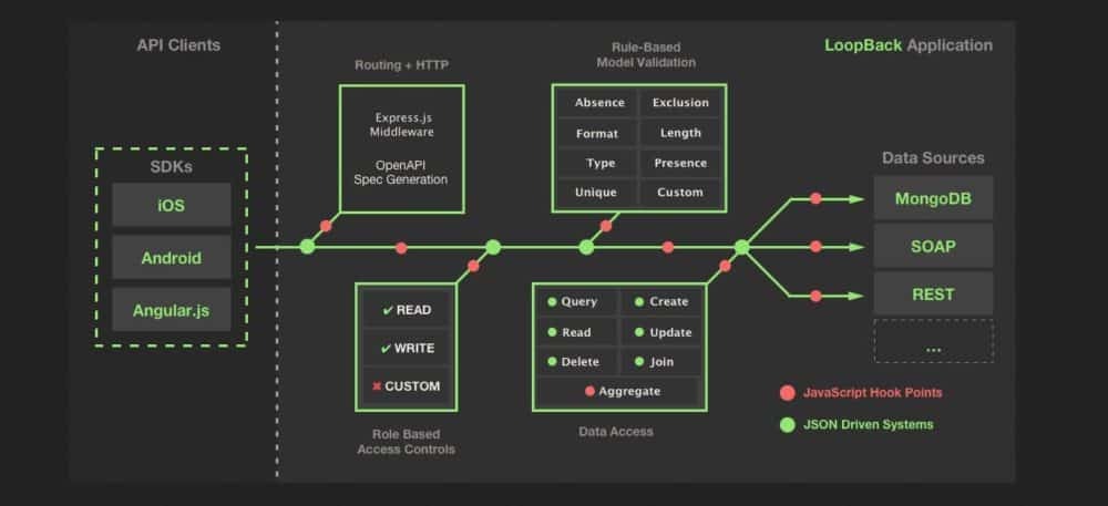 LoopBack has: Easy-to-use CLI wizard, Built-in API Explorer, Model relation support, Easy authentication and authorization setup, Built-in role-based access controls, oAuth user and registration models baked in browser support (JSONP and CORS) and MIT Open-Source license.LoopBack also uses Juggler which connects to backend data stores like MySQL, Oracle, MongoDB, Postgres and others, Other REST services; Discovery APIs for Oracle, MySQL, PostgreSQL and SQL Server.