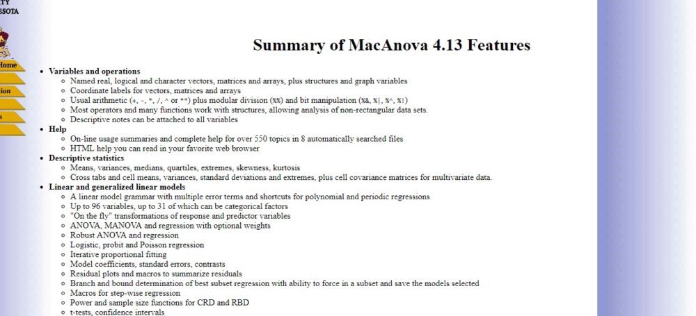 MacAnova contains several capabilities though it is most proficient in analysis of variance and related models, matrix algebra, time series analysis (time and frequency domain), and to a lesser extent uni-variate and multi-variate exploratory statistics. It is reasonably fast and is extensible through macros. It supports direct importing of data from spreadsheets using and exporting of data and results to other programs using the clipboard.