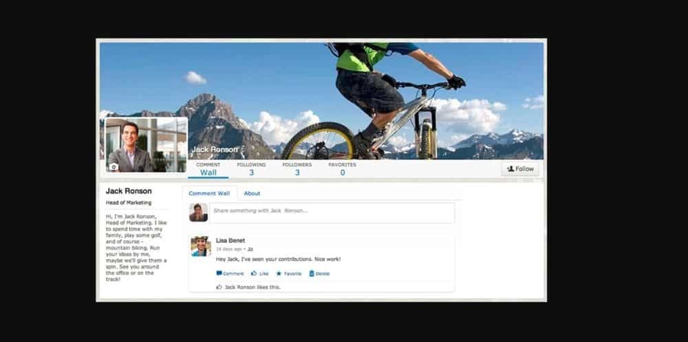The first one is Social Intranet, which enables employees to collaborate, manage information, organize resources and learn. It has a social profile and people directory, a live newsfeed, the possibility of creating teams and groups, and the buttons to like, comment and mark as favourite, and ask questions if workers have queries.