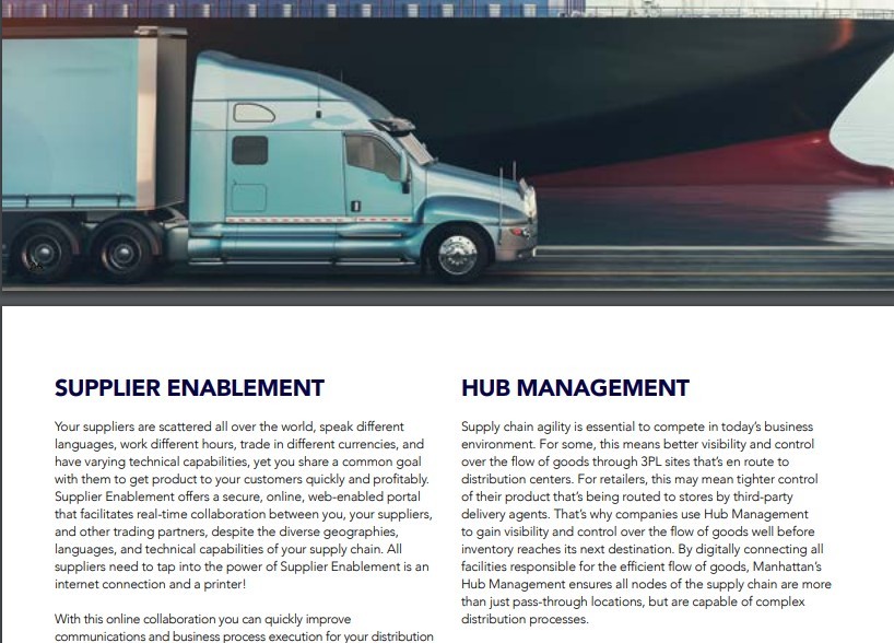 Manhattan SCM is a supply management software that provides architected solutions that break down the silos and enable the supply chain to serve top line growth without sacrificing the bottom line performance.